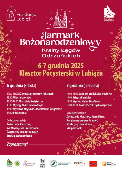 Kraina Łęgów Odrzańskich zaprasza na Jarmark Bożonarodzeniowy w Klasztorze Lubiąż 6–7 grudnia! Zapraszamy na magiczny, pełen świątecznych atrakcji weekend w Klasztorze Lubiąż jednym z najpiękniejszych miejsc Dolnego Śląska! Czeka na Was wyjątkowy klimat, moc smaków, rękodzieło i atrakcje dla całej rodziny.