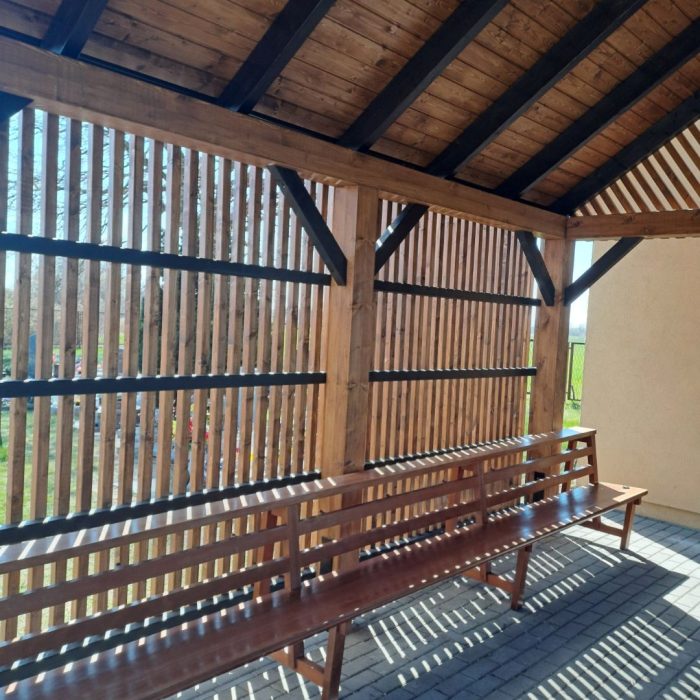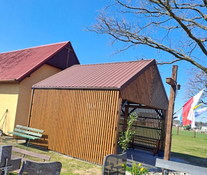 To kolejna inwestycja, która podnosi funkcjonalność oraz estetykę tego ważnego dla mieszkańców miejsca. Nowa wiata została zaprojektowana jako obiekt wolno stojący o powierzchni 22,1 m². Powstała w formie drewnianej konstrukcji z dachem dwuspadowym, pokrytym blachą trapezową w kolorze brązowym. Jej wygląd został dopasowany do istniejącej kaplicy, dzięki czemu całość tworzy spójną i estetyczną przestrzeń.