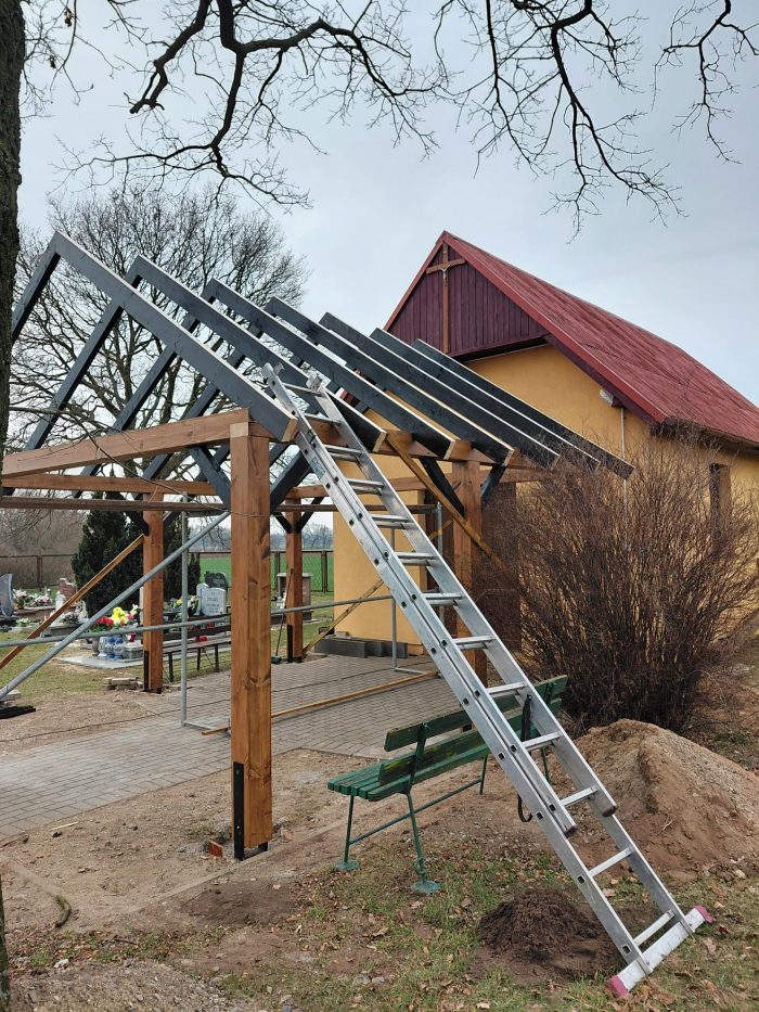 Na cmentarzu w Kluczach trwa budowa nowej drewnianej wiaty, która powstaje przed wejściem do budynku kaplicy. To inwestycja, która poprawi funkcjonalność i estetykę tego ważnego dla mieszkańców miejsca.