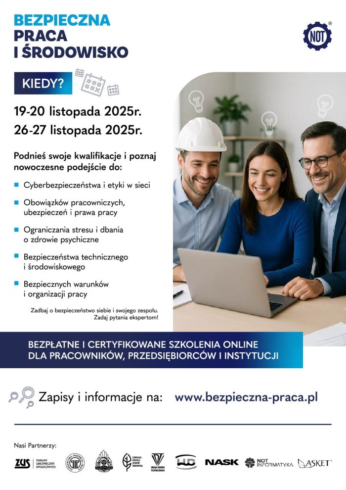 Federacja Stowarzyszeń Naukowo-Technicznych NOT wraz z Partnerami zaprasza do udziału w ogólnopolskim programie edukacyjnym „Bezpieczna Praca i Środowisko 2025”, skierowanym do pracowników, przedsiębiorców oraz instytucji.