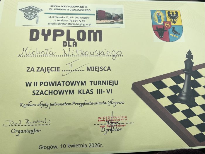 Michał Witkowski oraz Krzysztof Myśliwiec ze Szkoły Podstawowej im. Jana Pawła II w Przedmościu reprezentowali swoją szkołę w Powiatowym Turnieju Szachowym, który odbył się w Głogowie. Rywalizacja była bardzo wyrównana i stała na wysokim poziomie, a każda partia wymagała od uczestników ogromnej koncentracji, opanowania i umiejętności przewidywania ruchów przeciwnika.
