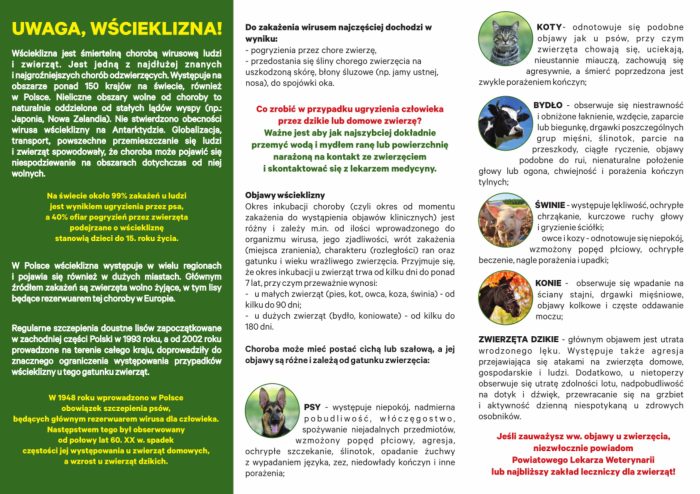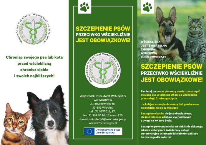 Powiatowy Lekarz Weterynarii w Głogowie apeluje o szczepienie psów przeciwko wściekliźnie. W Polsce obowiązkowemu ochronnemu szczepieniu przeciwko wściekliźnie podlegają psy powyżej 3. miesiąca życia, a następnie nie rzadziej niż co 12 miesięcy od dnia ostatniego szczepienia. Szczepień psów i kotów przeciwko wściekliźnie dokonują lekarze weterynarii świadczący usługi weterynaryjne w ramach zakładu leczniczego dla zwierząt. Koszty szczepienia zwierzęcia pokrywa jego właściciel.