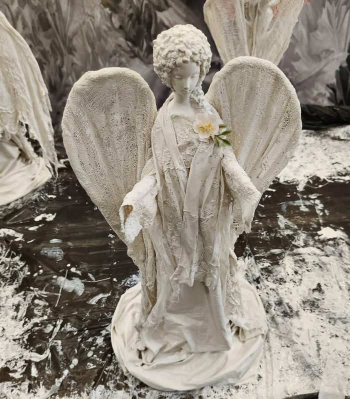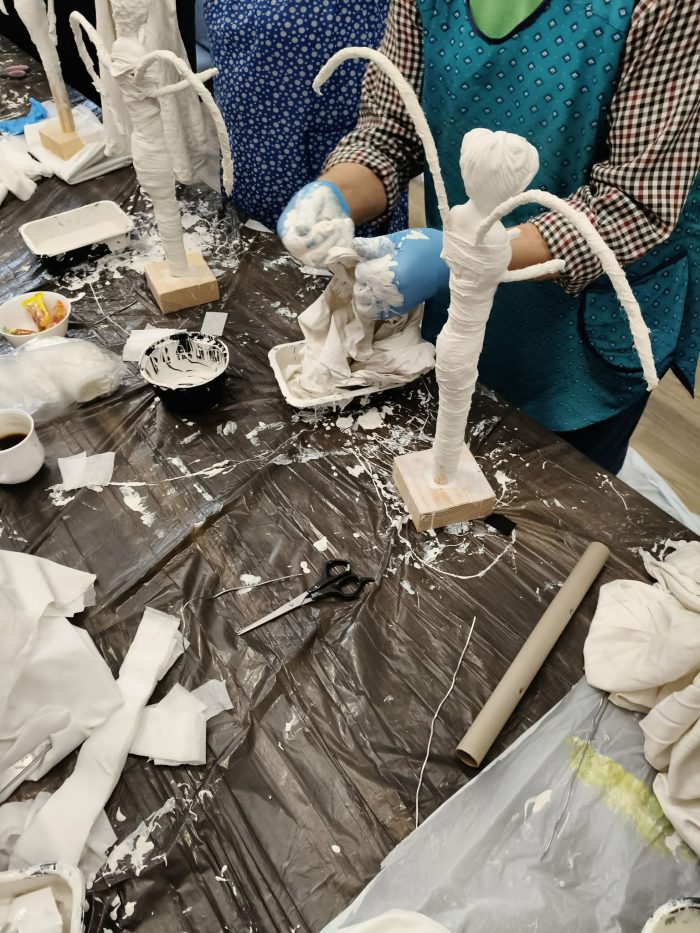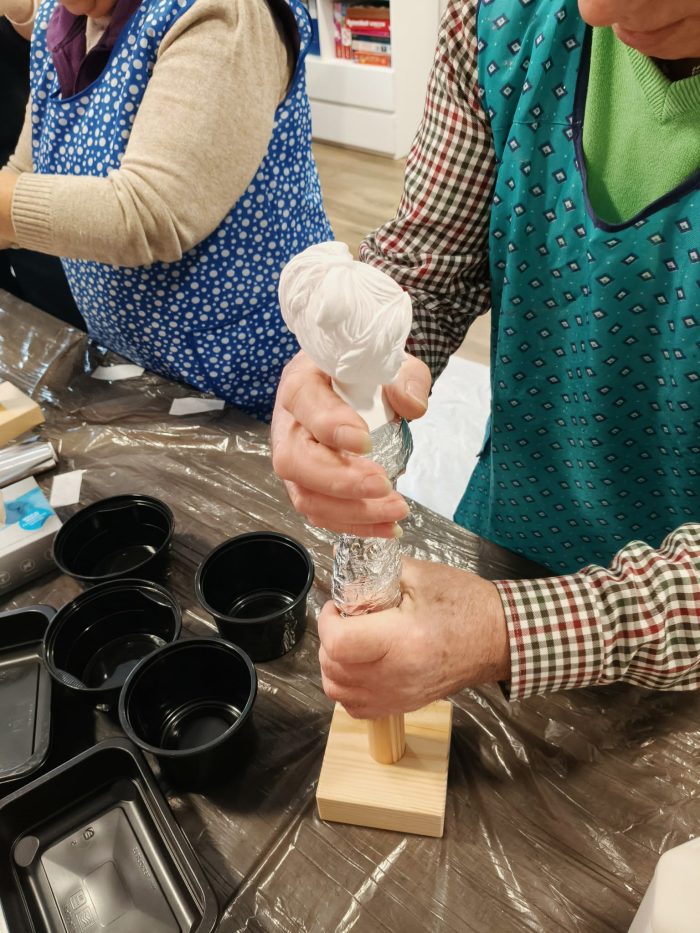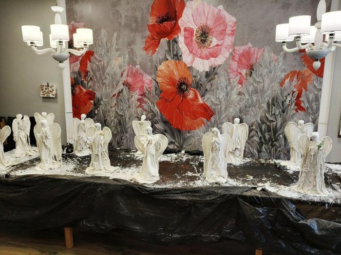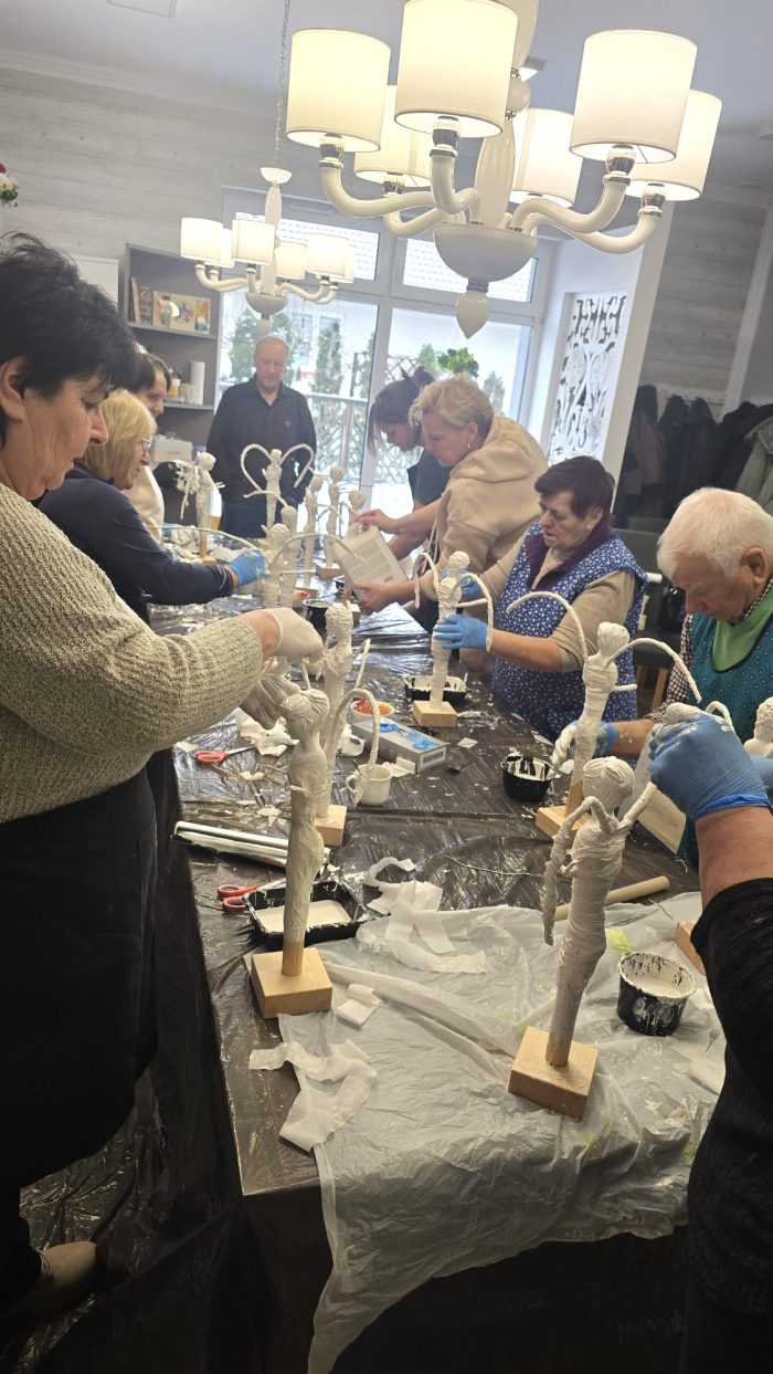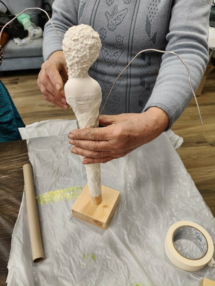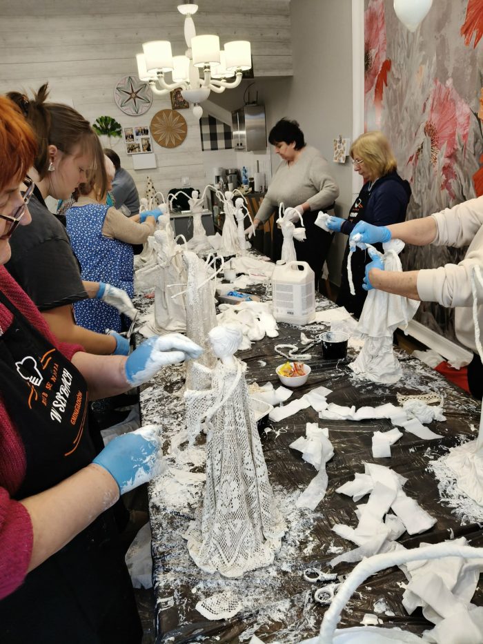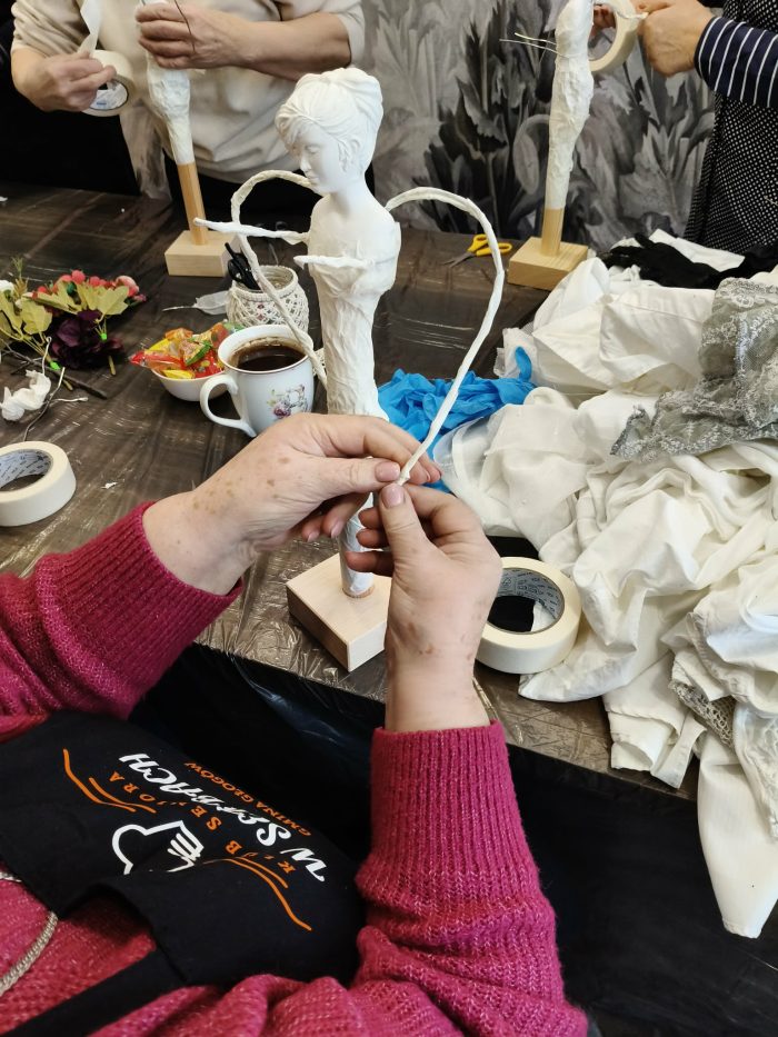 Powertex to technika, w której przy pomocy specjalnego preparatu utwardzającego można nadać materiałom (np. tkaninie) trwały kształt. Seniorzy formowali postacie, układali „szaty” aniołów z materiału, a po wyschnięciu dekoracje można dodatkowo wykończyć – np. delikatnie pomalować lub dodać efekty postarzenia. Dzięki temu każda praca była jedyna w swoim rodzaju.