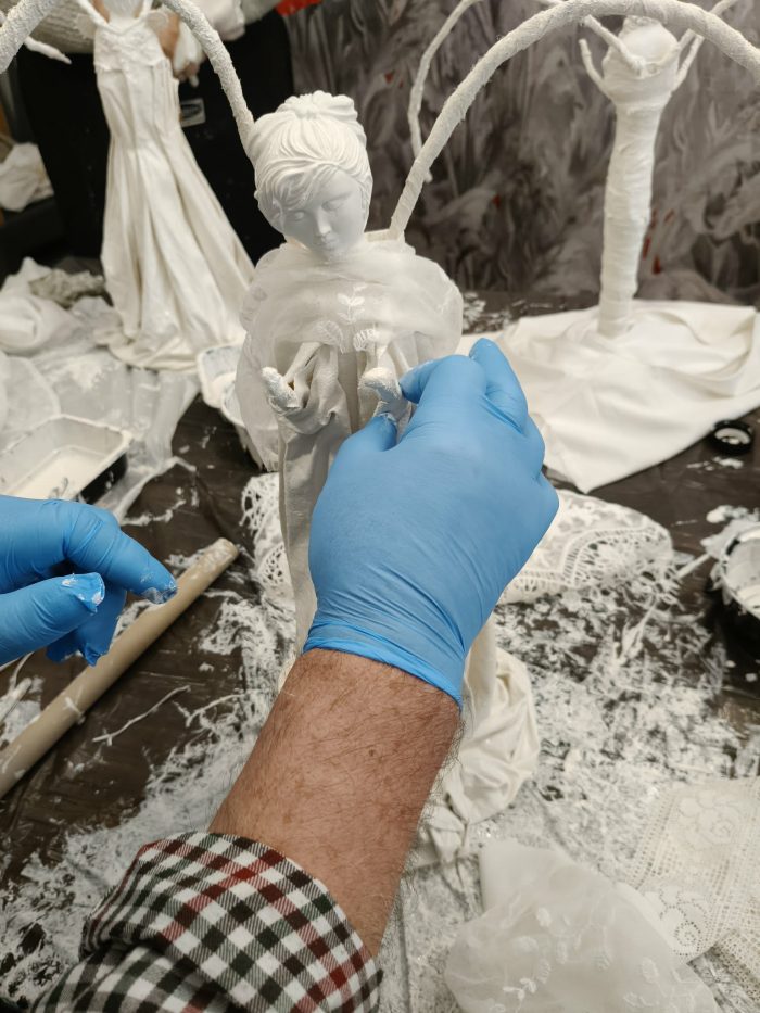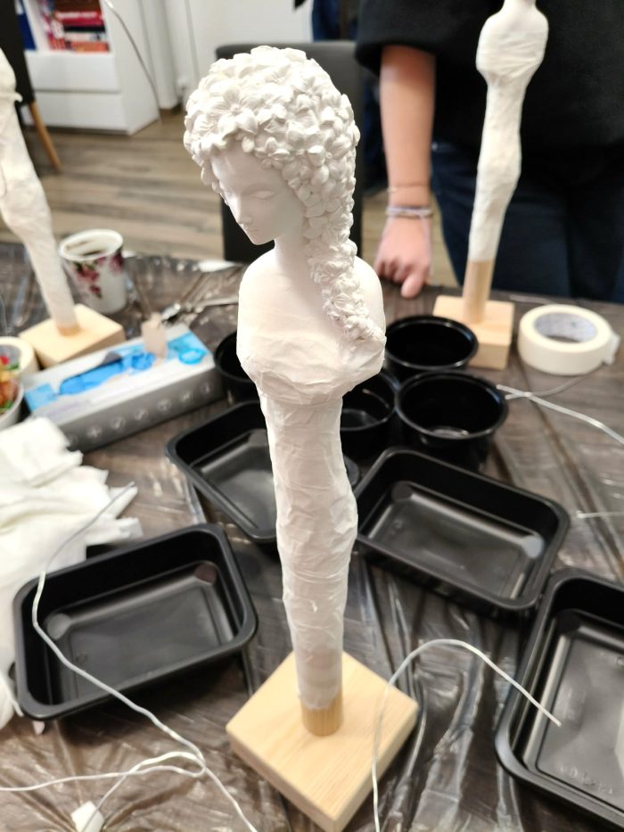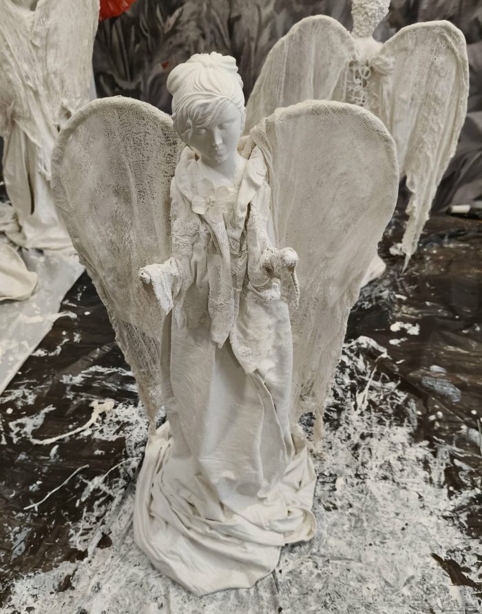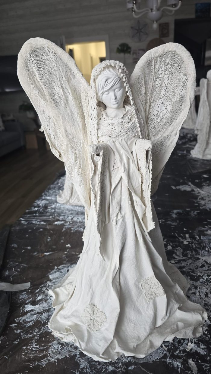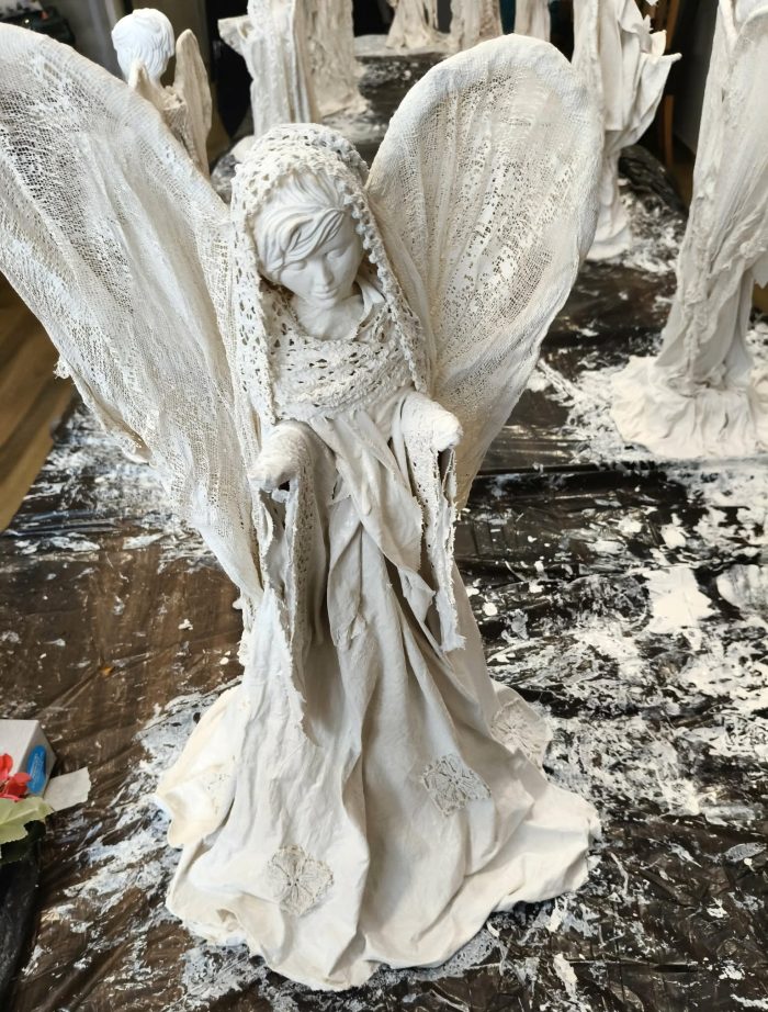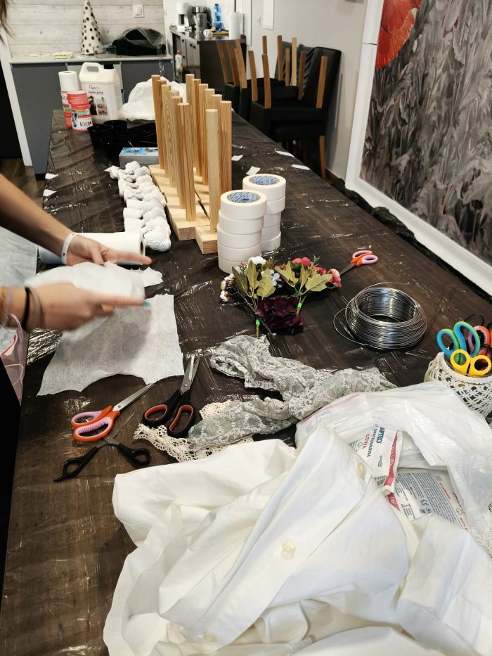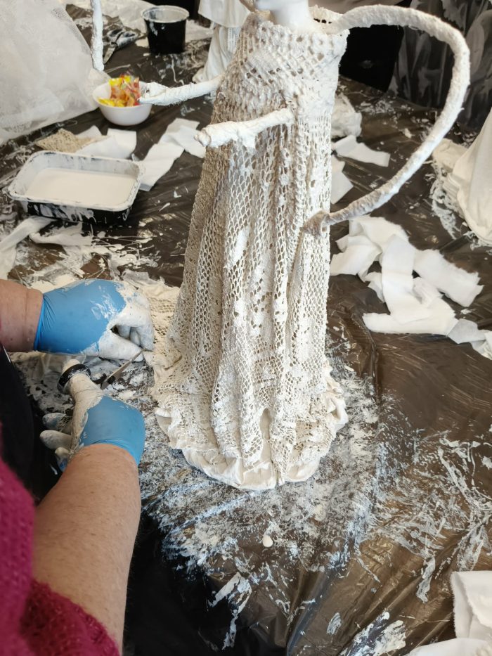 Powertex to technika, w której przy pomocy specjalnego preparatu utwardzającego można nadać materiałom (np. tkaninie) trwały kształt. Seniorzy formowali postacie, układali „szaty” aniołów z materiału, a po wyschnięciu dekoracje można dodatkowo wykończyć – np. delikatnie pomalować lub dodać efekty postarzenia. Dzięki temu każda praca była jedyna w swoim rodzaju.