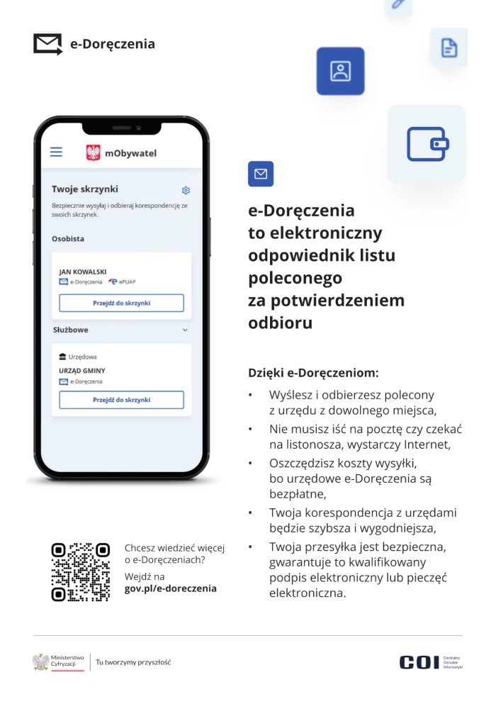 Jednocześnie prosimy osoby, które posiadają już aktywną skrzynkę e-Doręczeń i chcą otrzymywać korespondencję z urzędu w formie elektronicznej, o przekazanie nam tej informacji. Będzie to dla nas bardzo pomocne.