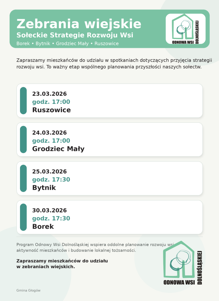 Mieszkańców Borku, Bytnika, Grodźca Małego i Ruszowic serdecznie zapraszamy do udziału w zebraniach wiejskich dotyczących przyjęcia Sołeckich Strategii Rozwoju Wsi. To ważny moment, w którym mieszkańcy mogą wspólnie zdecydować o kierunkach rozwoju swoich miejscowości na najbliższe lata.