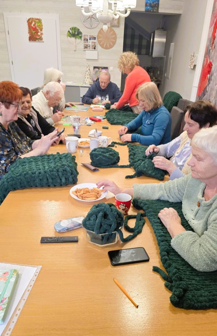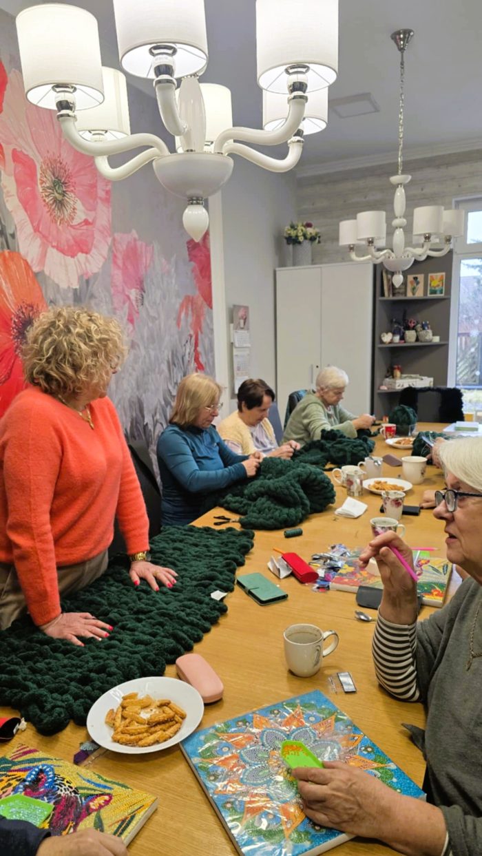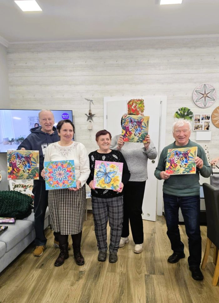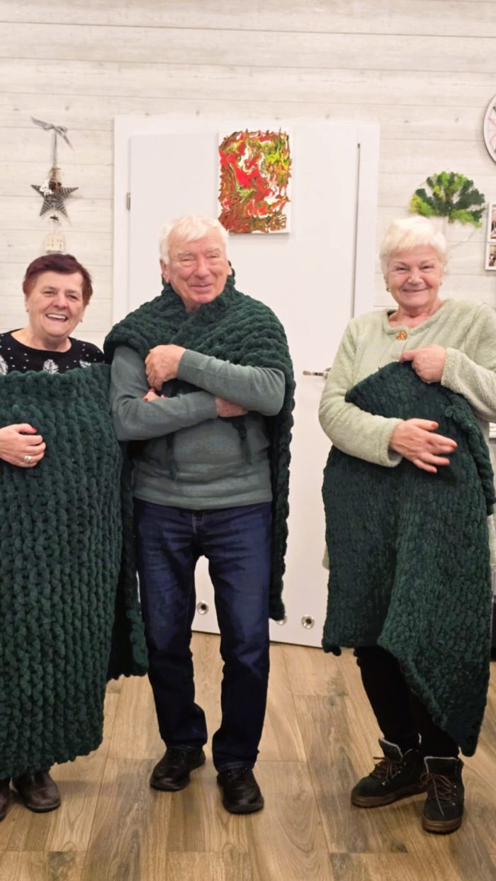 Podczas zajęć rękodzielniczych seniorzy wyplatali koc rękoma – była to doskonała okazja do rozwijania zdolności manualnych, koncentracji i kreatywności. Dużym zainteresowaniem cieszyły się również zajęcia plastyczne – malowanie po numerkach, które pozwoliło na chwilę relaksu i twórczego wyciszenia.